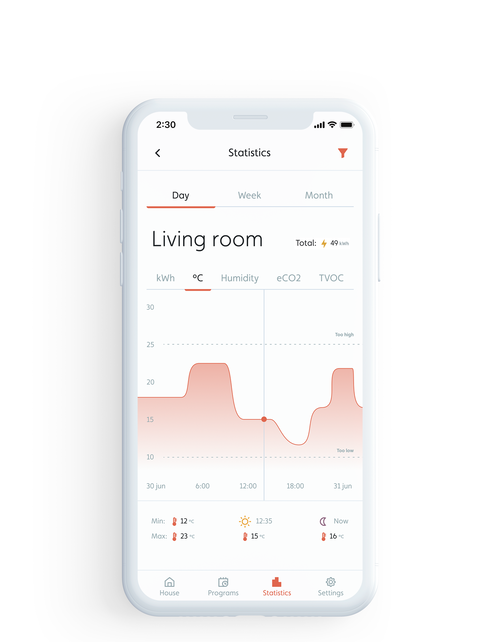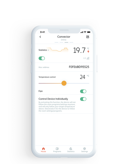 Folosind aplicația puteți controla toate convectoarele din casă și vizualiza statisticile de consum ale fiecărui dispozitiv, reducându-le cu până la 25%. În acest fel veți economisi energie, respectând mediul înconjurător și reducând costurile facturii dvs. de energie electrică.