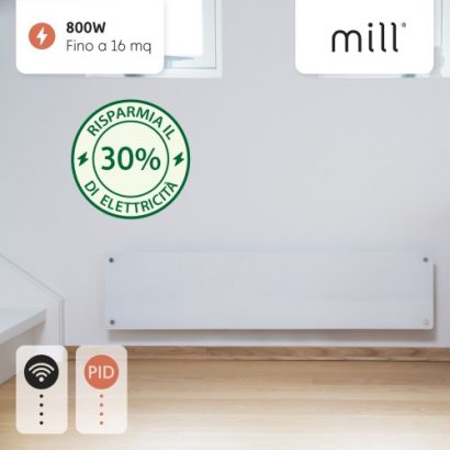 Convectorul de perete Mill Glass 800W are WiFi încorporat, care vă permite să vă monitorizați consumul de energie electrică direct de pe smartphone, datorită aplicației Millheat.