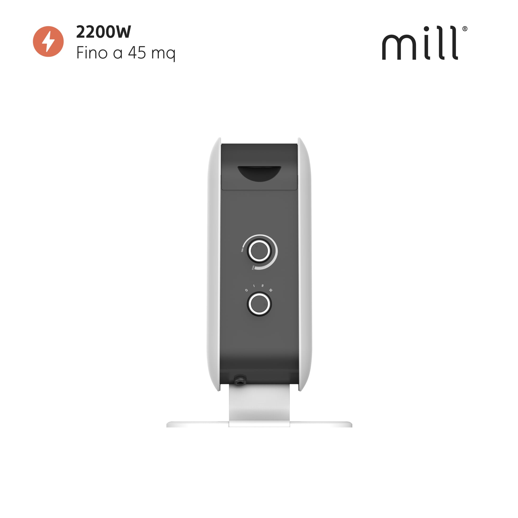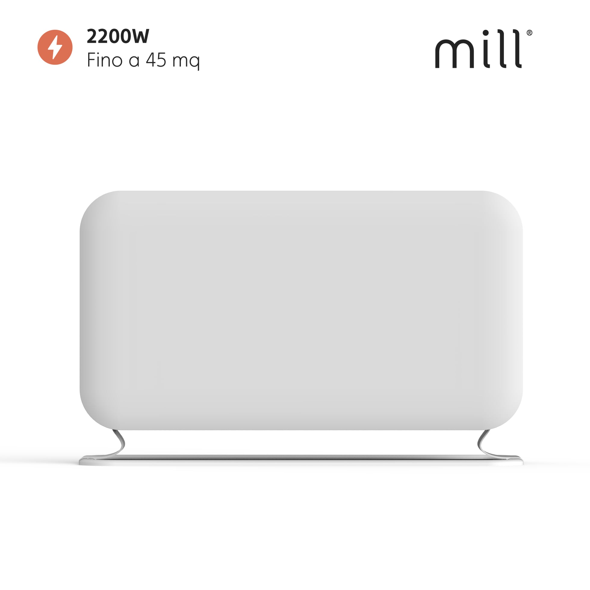 Convectorul Mill Instant Convection 2200W MEC are margini moi rotunjite, părți ușor curbate și o parte centrală neagră care subliniază designul minimalist. Forma discretă și unghiul picioarelor fac ca convectorul să pară suspendat pe podea.